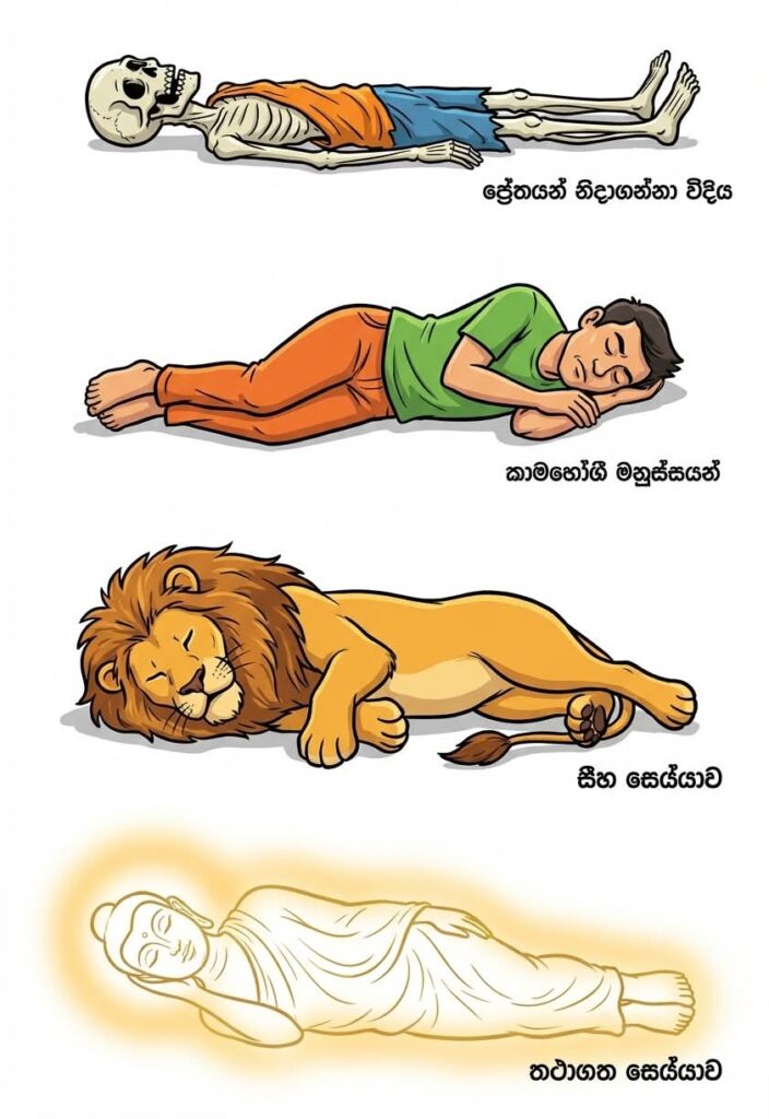 බුදුරජාණන් වහන්සේ අංගුත්තර නිකායේ සෙය්යා සූත්රයේදී ලෝකයේ දකින්න ලැබෙන සැතපෙන ඉරියව් හතරක් ගැන බොහොම අපූරු විස්තරයක් කරලා තියෙනවා. අපි හැමදාම