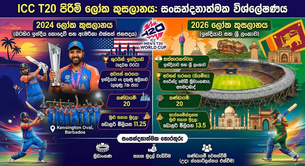 2024 සහ 2026 වසරවල පැවැත්වෙන ICC පිරිමි T20 ලෝක කුසලාන තරගාවලීන් දෙක අතර සංසන්දනාත්මක විශ්ලේෂණයක් පහත දැක්වේ. 2024 වසරේදී ඉන්දියාව