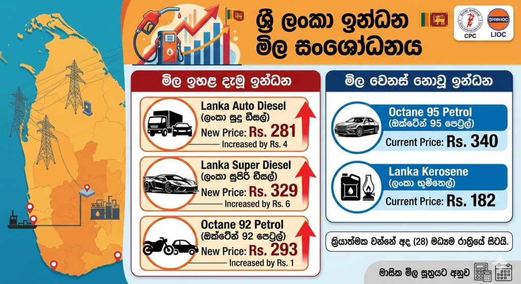 මාසික මිල සූත්රයට අනුව අද (28) මධ්යම රාත්රියේ සිට ක්රියාත්මක වන පරිදි ඉන්ධන මිල සංශෝධනය කිරීමට ලංකා ඛනිජ තෙල් සංස්ථාව