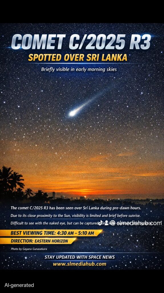 C/2025 R3 වල්ගාතරුව අලුයම කාලයේ ශ්රී ලංකා අහසේ සීමිත ලෙස දර්ශනය වීම. C/2025 R3 ලෙස හඳුන්වන වල්ගාතරුවක් පසුගිය දින කිහිපය