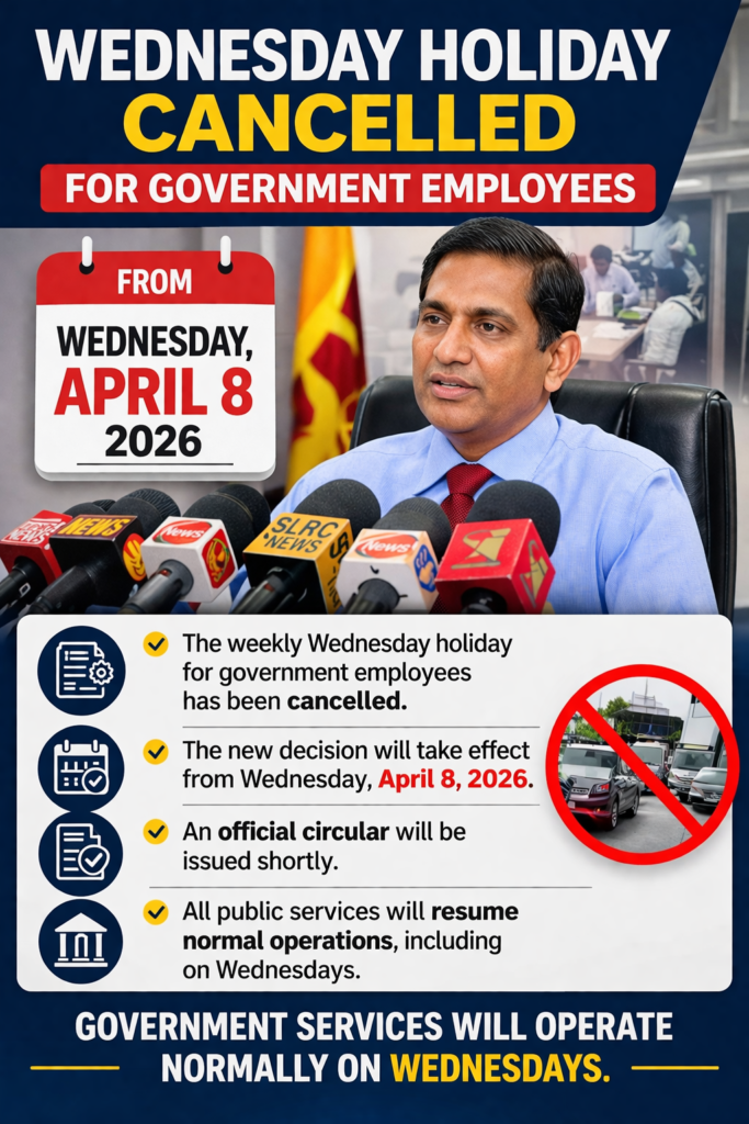 බදාදා නිවාඩුව අවලංගු කරයි… රට තුළ ඇතිවූ ඉන්ධන අර්බුදය හේතුවෙන් හඳුන්වා දී තිබූ සෑම බදාදා දිනම රජයේ නිවාඩුවක් ලෙස ප්රකාශ