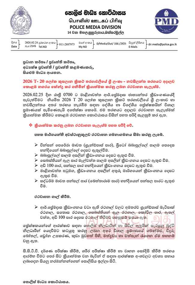 T-20 තරගය සම්බන්ධයෙන් හෙට (25) පැවැත්වෙන ශ්‍රී ලංකාව සහ නවසීලන්තය අතර තරගය සඳහා විශේෂ රථ වාහන සැලැස්මක් ක්‍රියාත්මක කෙරෙන බව පොලීසිය පවසයි.